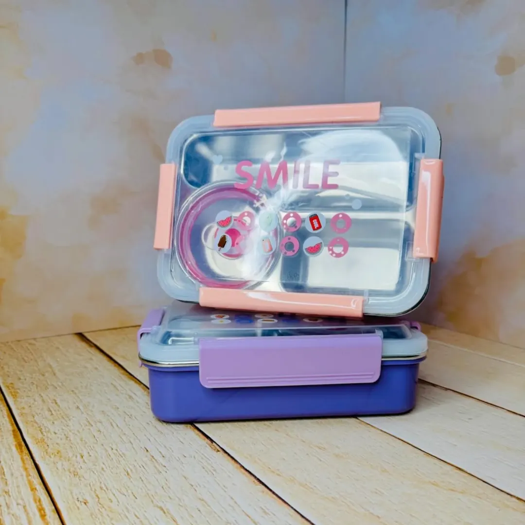 لانچ باکس چهار قفل SMILE دارای قسمت بندی عالی جنس بدنه پلاستیک درجه یک درب اکریلیک در ۳ طرح و رنگ درب قفلی ارتفاع ۷ سانت طول ۲۲ سانت عرض ۱۶ سانت استیل قابل جداشدن میباشد ۴ قسمتی دارای یک باکس کوچک استیل درب پلاستیک دارای یک قاشق پلاستیکی
